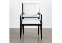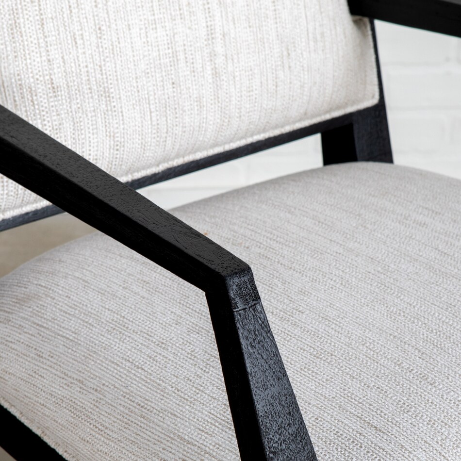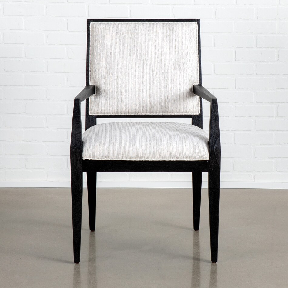 Tailored and timeless, the Ada Arm Chair has a comfortable upholstered seat and back in the neutral performance fabric Remington Porcelain with welt trim. The crisp wood frame is finished in Shadow, a charred black finish achieved through Shou Sugi Ban, a Japanese technique that creates a look resembling burnt wood.